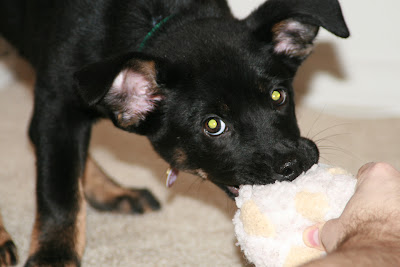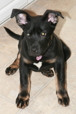 Seattle Humane Society on Thursday, January 17. I am a 3 month old Shepherd mix. I came into the shelter as a stray, so they don't know who my parents are and they can't tell by looking at me what I am for sure cuz I'm so young, but I certainly look like I've got some German Shepherd in me. I'm mainly black with brown on my legs and jaw line, white and brown on my chest and a brown patch on my bum that makes me look a bit like a baboon.